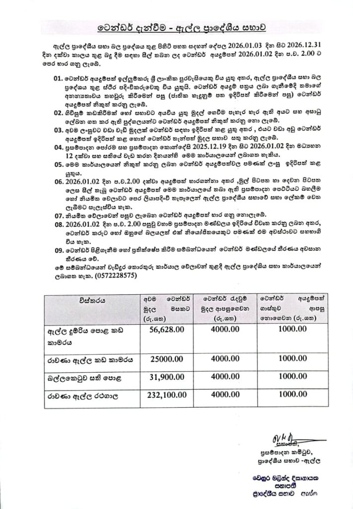 ඇල්ල ප්රාදේශීය සභාවට අයත් දේපල බදු ලබා දීම සඳහා 2025.12.19 දින සිට 2026.01.02 දින ප.ව. 2.00 දක්වා අයදුම්පත් භාර ගනු ලැබේ.